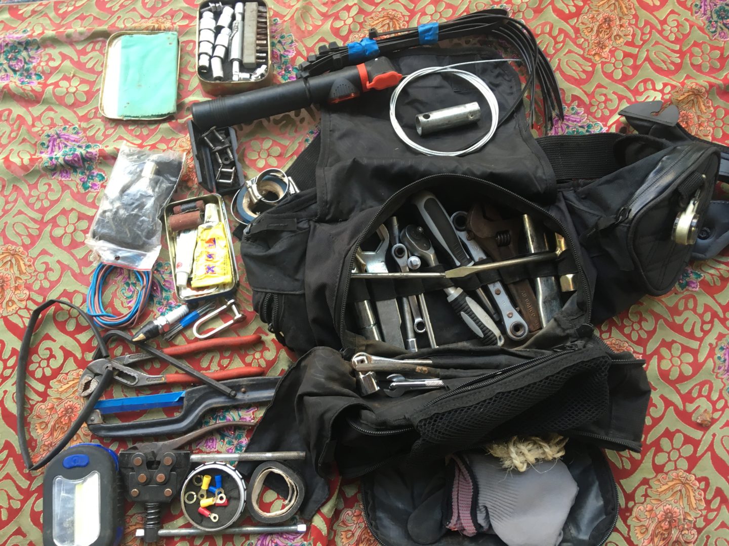 With an Asian dirt bike tour, or any dirt bike tour for that matter, a fairly decent toolkit slash spare part kit was going to be essential. We would be driving bikes that we might not be able to get part for. I had lots of tools lying around and my OGIO MX 450 tool pack, so I started collecting. Duct tape. Heat shrink. Fuses. Light bulbs. Nuts. Bolts. Spanners, and other hand tools were collected and adapted to be as light as possible. With the stock tools that come with a new Kawasaki KLX we should be well covered.